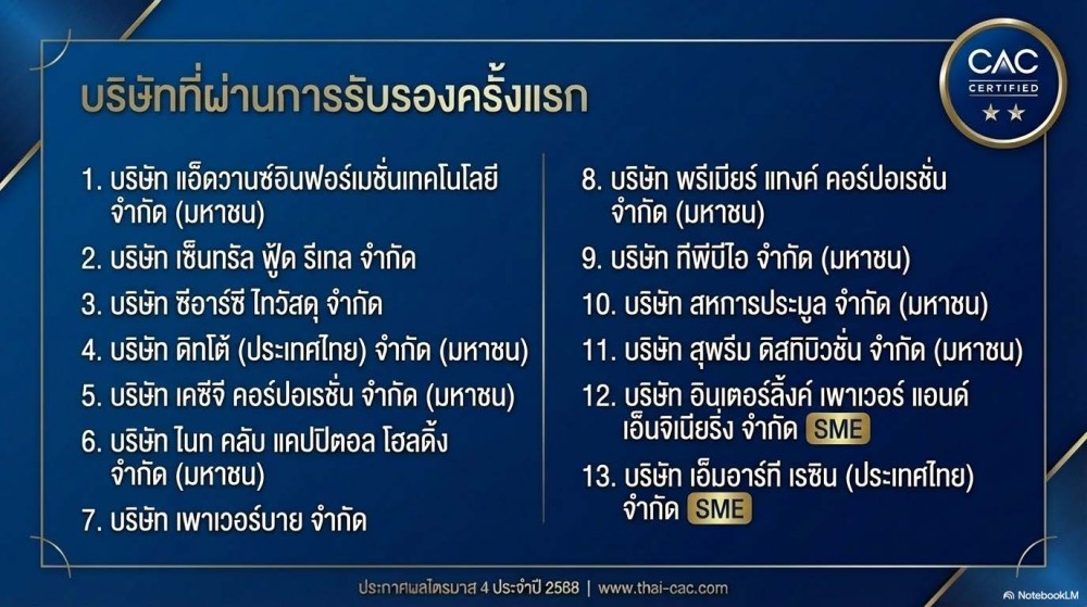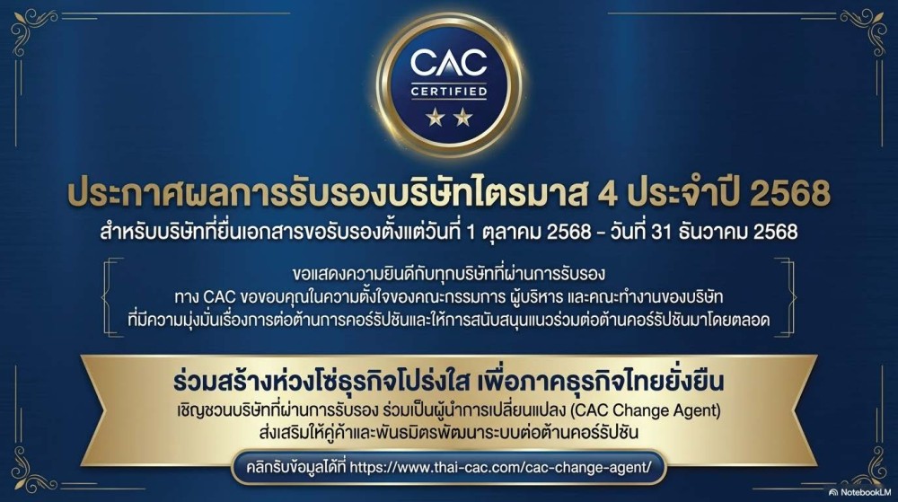 ทั้งนี้ CAC ได้ประกาศผลการให้การรับรองบริษัทในไตรมาส 4 ประจำปี 2568 สำหรับองค์กรที่ยื่นขอรับรองในช่วงระหว่างวันที่ 1 ตุลาคม – 31 ธันวาคม 2568 โดย IPOWER เป็น 1 ในจำนวน 13 บริษัท ที่ได้รับการรับรองเป็นสมาชิกใหม่ สะท้อนถึงการผ่านกระบวนการประเมินอย่างเข้มข้นในด้านนโยบาย มาตรการ และระบบควบคุมภายในที่มีประสิทธิภาพในการป้องกันการให้และรับสินบน