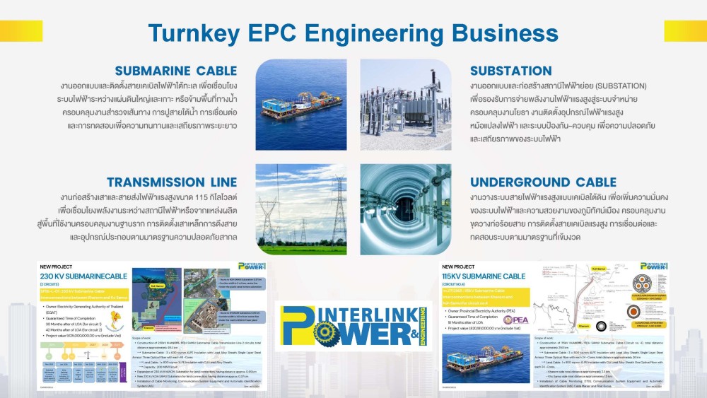 ปัจจุบันบริษัทฯ ได้รับการประกาศเป็นผู้ชนะประมูลโครงการวางสายเคเบิลใต้น้ำระบบ 115 เควี มูลค่าประมาณ 1,800 ล้านบาท ซึ่งอยู่ระหว่างรออนุมัติเริ่มดำเนินงาน และยังอยู่ระหว่างเข้าร่วมประมูล โครงการสายเคเบิลใต้น้ำระบบ 230 เควี มูลค่าประมาณ 9,125 ล้านบาท ซึ่งหากได้รับคัดเลือก จะเป็นปัจจัยสำคัญต่อการขยายตัวของธุรกิจวิศวกรรมในอนาคต และนับเป็นอีกหนึ่งก้าวสำคัญในการยกระดับศักยภาพธุรกิจวิศวกรรมของบริษัทฯ สู่การเติบโตในระดับโครงการขนาดใหญ่ของประเทศ