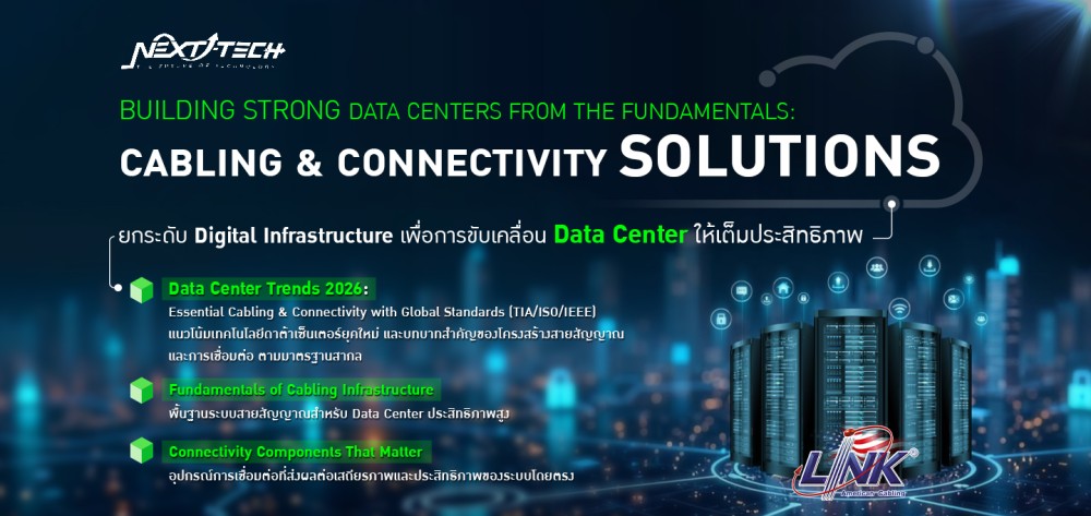 องค์กรยุคใหม่ไม่อาจมองข้าม “Infrastructure ที่ดี” คือ จุดเริ่มต้นของความสำเร็จในยุคดิจิทัล วันนี้ (8 เมษายน 2569) บริษัท อินเตอร์ลิ้งค์ คอมมิวนิเคชั่น จำกัด (มหาชน) จัดงานสัมมนาออนไลน์ “Next Tech: Building Strong Data Centers from the Fundamentals: Cabling & Connectivity Solutions” เพื่อถ่ายทอดองค์ความรู้เชิงลึกด้านการออกแบบ และพัฒนา Data Center อย่างมีประสิทธิภาพ ต้องเริ่มต้นตั้งแต่ “พื้นฐานที่ถูกต้อง” สู่การใช้งานจริงในระดับองค์กร