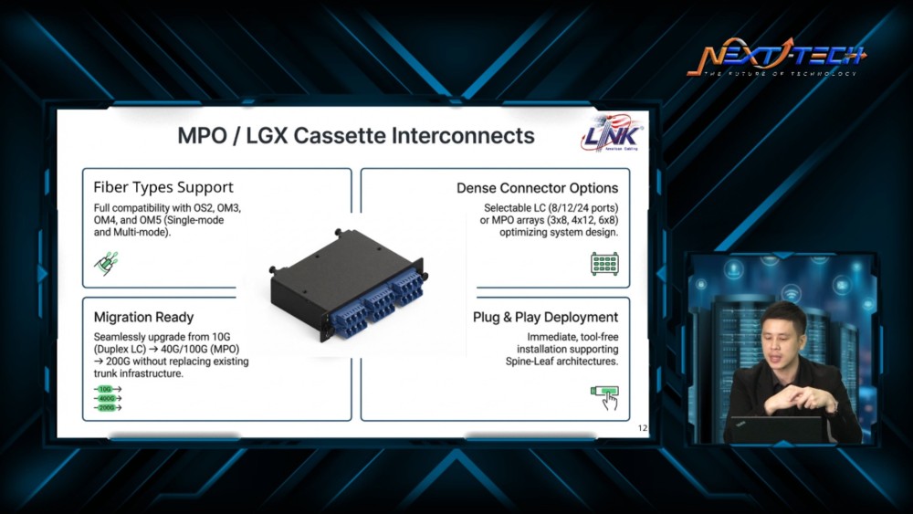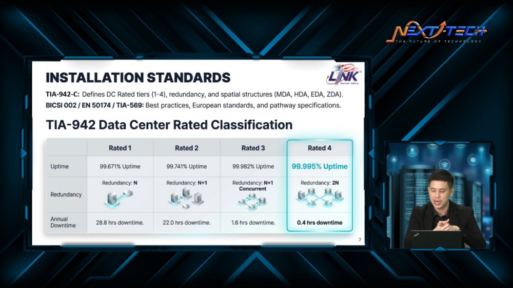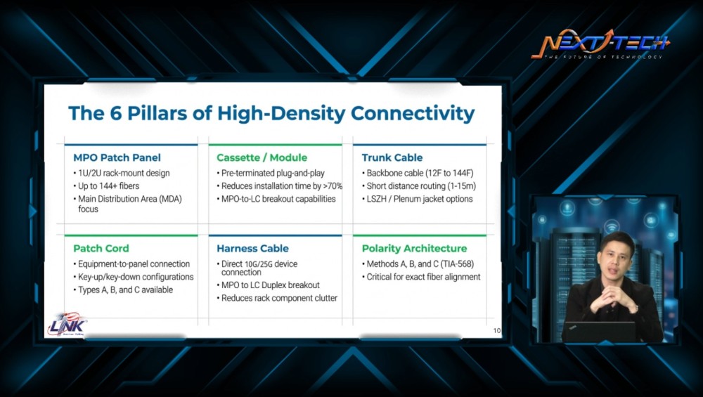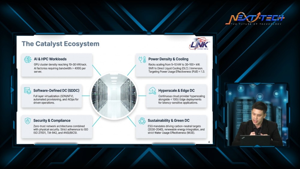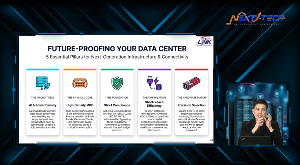 ภายในงานได้รับเกียรติจาก นายธนากร ชนะวงศ์วิสุทธิ์ Network Engineer Manager วิทยากรผู้เชี่ยวชาญด้านระบบโครงสร้างพื้นฐานสายสัญญาณ และการเชื่อมต่อ จาก LINK มาร่วมถ่ายทอดองค์ความรู้ พร้อมยกตัวอย่างกรณีศึกษาที่สามารถนำไปประยุกต์ใช้ได้จริง ครอบคลุมทั้งมุมมองเชิงเทคนิค และเชิงกลยุทธ์ เพื่อให้องค์กรสามารถวางแผนพัฒนา Data Center ได้อย่างเหมาะสมกับการใช้งานในปัจจุบัน และรองรับการเติบโตในอนาคต