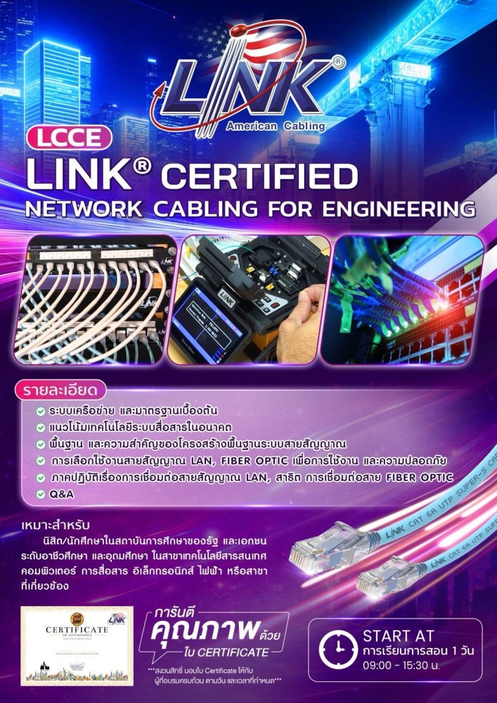 เมื่อวันที่ 19 กุมภาพันธ์ 2569 ได้จัดอบรมหลักสูตร LCCE (LINK Certified Cabling Engineer) ณ คณะวิศวกรรมศาสตร์ มหาวิทยาลัยแห่งชาติลาว ให้แก่ นักศึกษาจากภาควิชาวิศวกรรมอิเล็กทรอนิกส์ และภาควิชาวิศวกรรมโทรคมนาคม ระดับชั้นปีที่ 1 – 4 รวมจำนวน 30 คน ณ มหาวิทยาลัยแห่งชาติลาว คณะวิศวกรรมศาสตร์ โดยมี เนื้อหาการอบรมประกอบด้วยการแนะนำแบรนด์ และผลิตภัณฑ์ LINK ควบคู่การฝึกปฏิบัติจริงผ่าน Workshop งานระบบ LAN (UTP) การเข้าหัวสายตัวผู้ – ตัวเมีย และ Workshop งาน Fiber Optic การเชื่อมต่อสายด้วยเทคนิค Splice F.O. เพื่อเสริมทักษะเชิงวิชาชีพให้แก่นักศึกษา ทั้งนี้ ผู้ผ่านการอบรมจะได้รับประกาศนียบัตรรับรองจากบริษัทฯ อีกด้วย