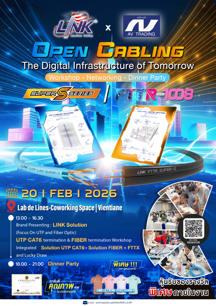 ถัดมาในวันที่ 20 กุมภาพันธ์ 2569 ได้จัดงาน Open Cabling : The Digital Infrastructure of Tomorrow (Working–Networking–Dinner Party) ณ Lab de Line โดยมี ผู้เข้าร่วมจากกลุ่ม Dealer และ User รวม 50 คน ภายในงานมีการจัด Session Training เพื่ออัปเดตผลิตภัณฑ์ และแนวโน้มเทคโนโลยี LINK ปี 2026 พร้อมนำเสนอแนวทางโซลูชัน LAN (UTP) และ FIBER OPTIC รวมถึงการอบรมเชิงปฏิบัติการ CAT6 and Fiber Termination Workshop ที่เปิดโอกาสให้ผู้เข้าร่วมได้ทดลองติดตั้งและเรียนรู้การใช้งานโซลูชัน LINK AMERICAN ในสถานการณ์จริง