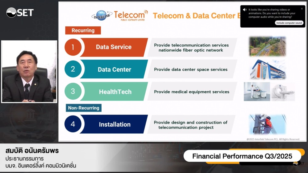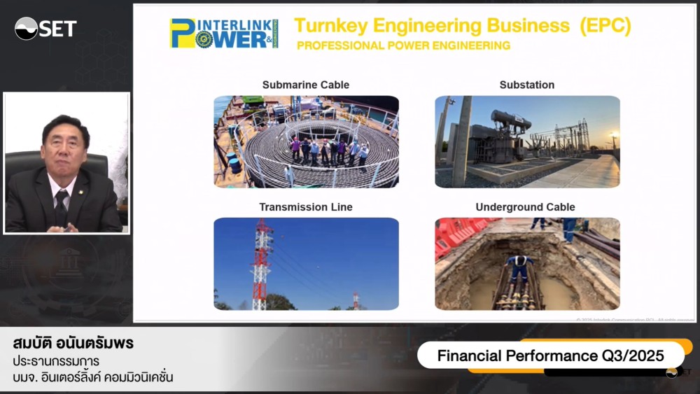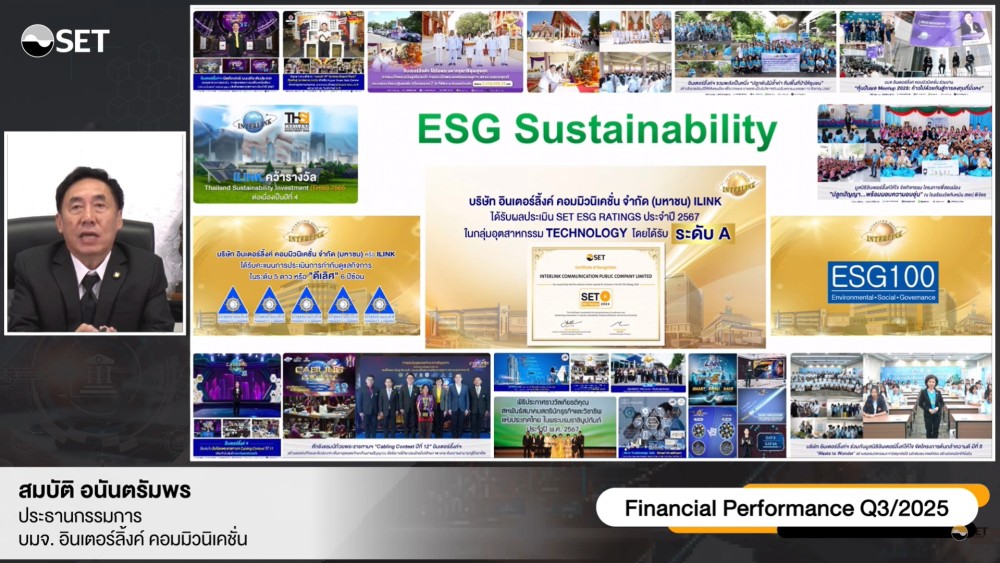 เติบโตชัดเจน วันนี้ (18 พฤศจิกายน 2568) บริษัท อินเตอร์ลิ้งค์ คอมมิวนิเคชั่น จำกัด (มหาชน) หรือ ILINK ร่วมนำเสนอผลประกอบการในงาน บริษัทจดทะเบียนพบผู้ลงทุน (Opportunity Day) ประจำไตรมาส 3/2568 จัดโดยตลาดหลักทรัพย์แห่งประเทศไทย (ตลท.) ผ่านระบบออนไลน์ (VDO Conference) โดยมี นายสมบัติ อนันตรัมพร ประธานกรรมการ กลุ่มบริษัท อินเตอร์ลิ้งค์ฯ เป็นผู้ร่วมบรรยาย และตอบข้อซักถามนักลงทุน พร้อมนำเสนอข้อมูลผลการดำเนินงานในช่วง 9 เดือนแรกของปี 2568 และแนวโน้มธุรกิจช่วงโค้งสุดท้ายของปี