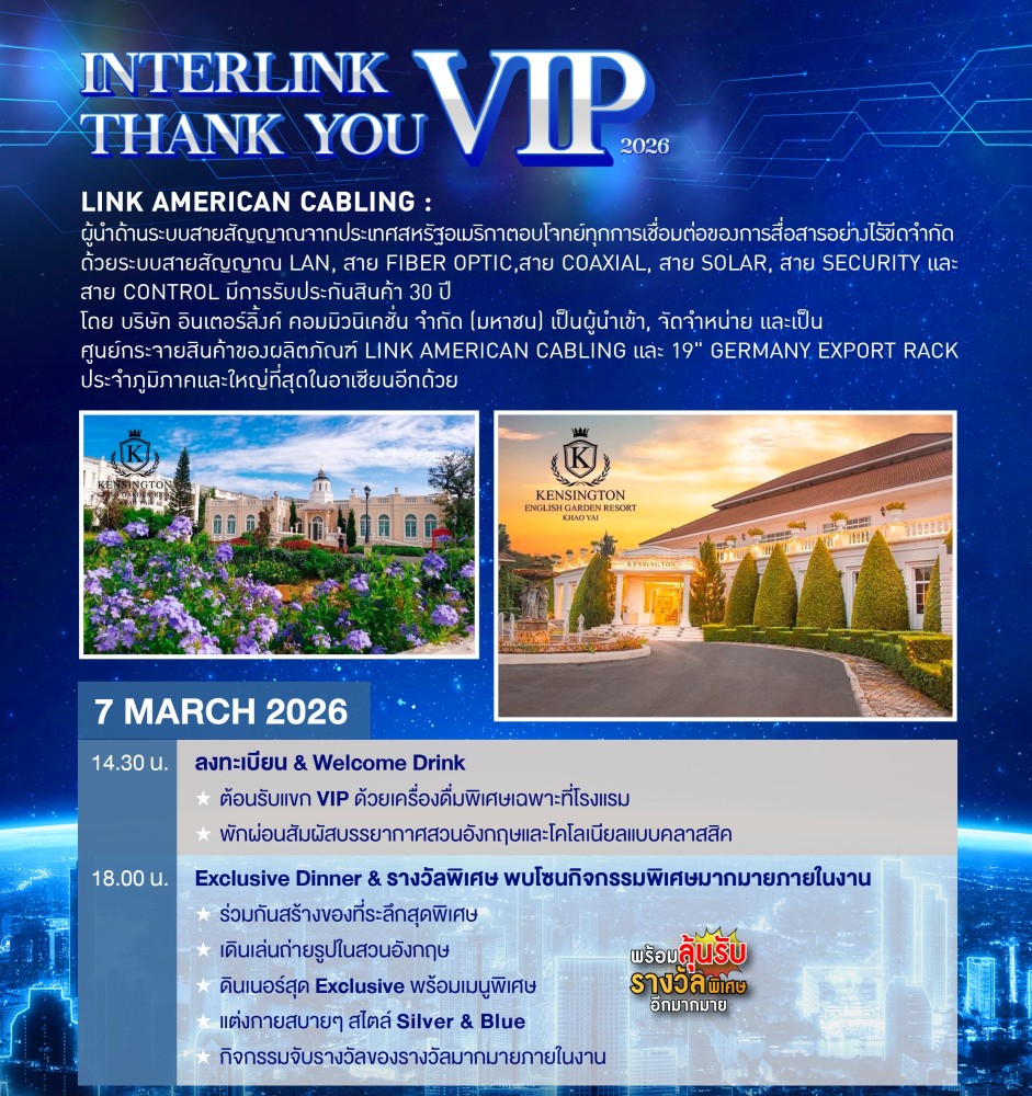 แทนคำขอบคุณ ที่เคียงข้างทุกก้าวของความสำเร็จ บริษัท อินเตอร์ลิ้งค์ คอมมิวนิเคชั่น จำกัด (มหาชน) ตอกย้ำความสัมพันธ์อันแน่นแฟ้นกับลูกค้า และพันธมิตรทางธุรกิจ ด้วยการจัดงาน “INTERLINK Thank You VIP 2026” งานเลี้ยงค่ำคืนแห่งการขอบคุณลูกค้า ผู้รับเหมาก่อสร้าง และพันธมิตรคนสำคัญของบริษัทฯ เพื่อแสดงความขอบคุณต่อความไว้วางใจ และการสนับสนุนที่มีต่อสินค้า LINK AMERICAN และ GERMAN RACK มาอย่างต่อเนื่อง