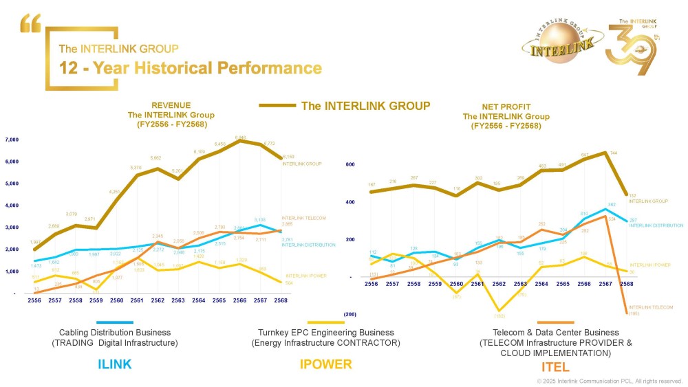 ในส่วนของภาพรวมตลอดทั้งปี 2568 กลุ่มบริษัท อินเตอร์ลิ้งค์ฯ ยังคงแสดงศักยภาพการเติบโตอย่างต่อเนื่อง ซึ่งเป็นแรงขับเคลื่อนสำคัญที่ส่งผลให้ตลอดทั้งปีที่ผ่านมา สามารถทำรายได้อย่างแข็งแกร่ง สมดุล และเป็นฐานกำลังสำคัญในการต่อยอดสู่เป้าหมายใหม่ สู่ก้าวใหม่ ก้าวที่ยิ่งใหญ่ ของปี 2569 ซึ่งรายได้ยังคงมาจาก 3 กลุ่มธุรกิจหลัก และสามารถทยอยรับรู้รายได้อย่างสม่ำเสมอ สอดคล้องกับแนวโน้มการลงทุนด้านโครงสร้างพื้นฐานดิจิทัลของประเทศ รวมถึงการเติบโตของเทคโนโลยีไฟฟ้า โทรคมนาคม อินเทอร์เน็ต และปัญญาประดิษฐ์ (AI) ที่มีบทบาทสำคัญต่อเศรษฐกิจยุคใหม่ พร้อมทั้งยังสามารถรักษาระดับผลกำไรให้เติบโตอย่างมั่นคง แม้อยู่ภายใต้สภาวะเศรษฐกิจที่มีความผันผวน เตรียมเดินหน้าขยายธุรกิจในอนาคตอย่างมีแบบแผน ควบคู่ไปกับการบริหารต้นทุนอย่างมีประสิทธิภาพ และยึดมั่นในหลักการกำกับดูแลกิจการที่ดี ซึ่งเป็นรากฐานสำคัญของการเติบโตอย่างยั่งยืน