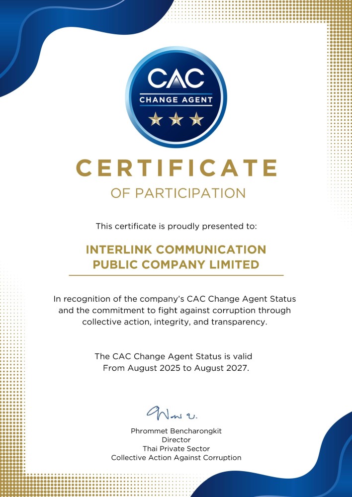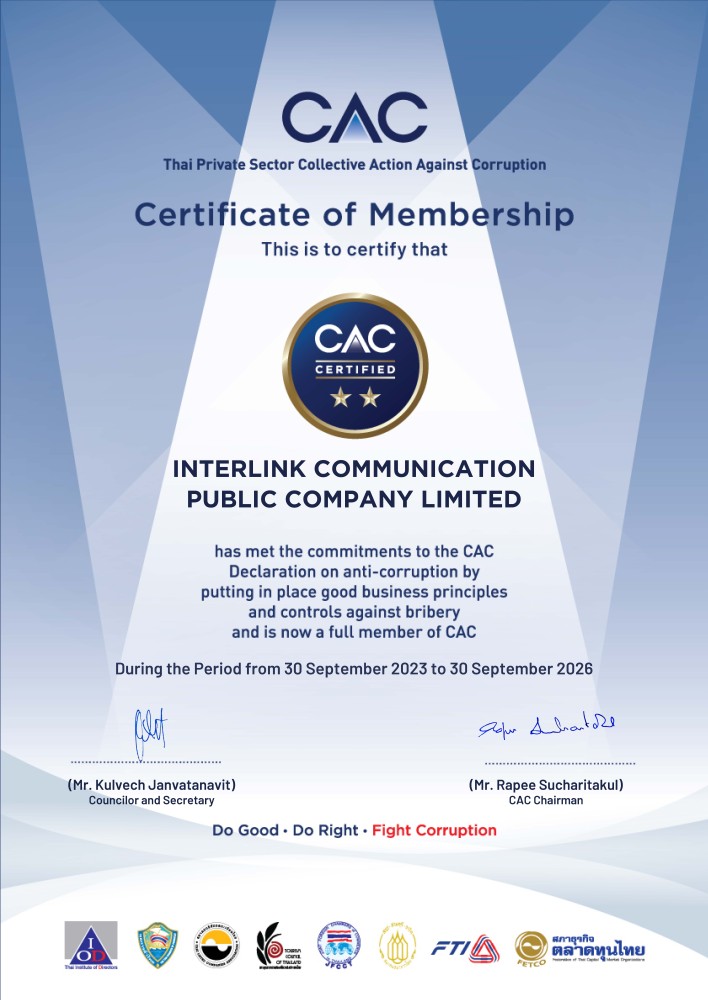 กลุ่มบริษัท อินเตอร์ลิ้งค์ฯ ยืนยันเจตนารมณ์ในการดำเนินธุรกิจด้วยความโปร่งใส มีธรรมาภิบาล และความรับผิดชอบต่อสังคม ภายใต้แนวคิด “Do Good · Do Right · Fight Corruption” เพื่อสร้างความเชื่อมั่นอย่างยั่งยืนให้แก่ผู้มีส่วนได้ส่วนเสียทุกภาคส่วน