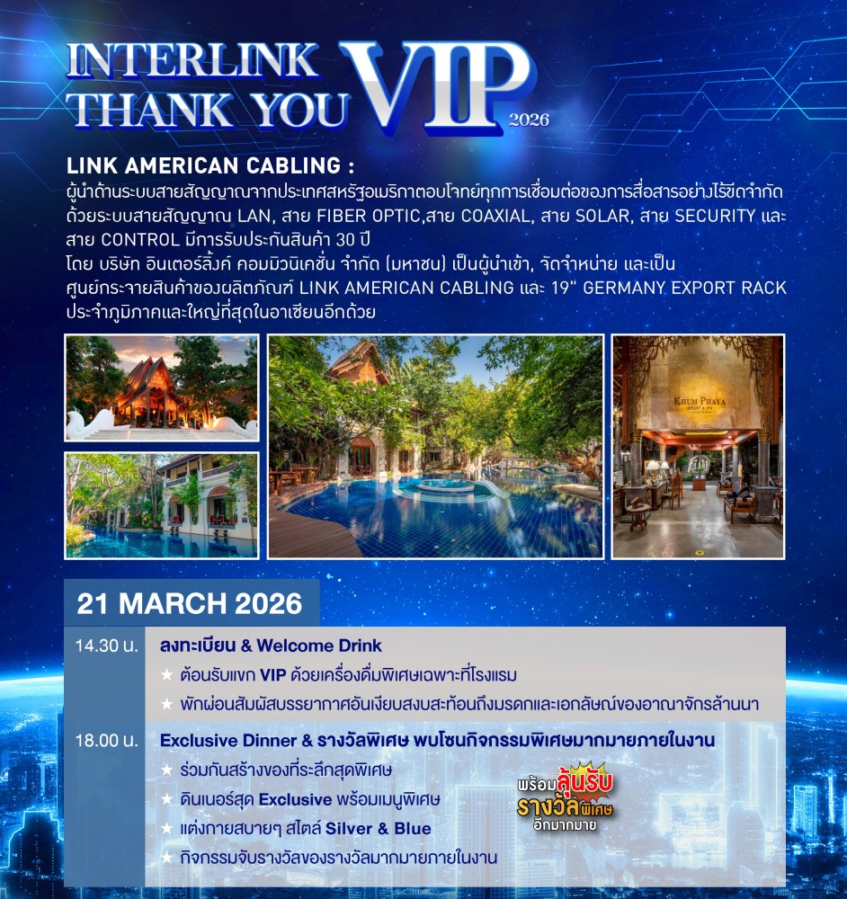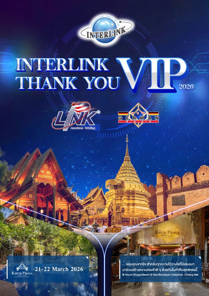 งาน “INTERLINK THANK YOU VIP 2026” ในครั้งนี้ ไม่เพียงเป็นเวทีแห่งการขอบคุณ แต่ยังเป็นพื้นที่สำคัญในการเสริมสร้างความสัมพันธ์อันแน่นแฟ้น เปิดโอกาสให้พันธมิตรทางธุรกิจได้พบปะ แลกเปลี่ยนมุมมอง และต่อยอดโอกาสทางธุรกิจร่วมกัน ซึ่งนับเป็นรากฐานสำคัญในการขับเคลื่อนอุตสาหกรรมโครงสร้างพื้นฐานด้านระบบเครือข่ายของประเทศให้เติบโตอย่างแข็งแกร่ง